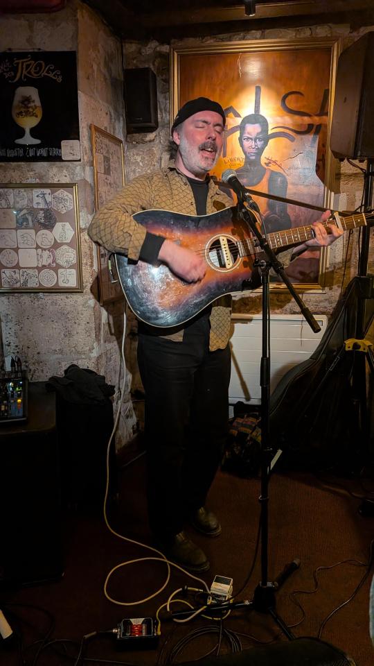 Début des festivités à La Girafe avec le chanteur folk Nick Wheeldon originaire de Sheffield (UK) mais installé en France. Il y a du monde à l’intérieur mais aussi beaucoup à l’extérieur, dans la rue. Il fait beau, demain c’est le printemps. Les conditions sont donc idéales pour proposer ce concept de concerts gratuits dans les bars d’Angoulême durant 3 jours. C’est un peu un concert en forme d’afterwork. Les gens sont là pour se retrouver, boire une bière et papoter. Mais avec un concert en même temps. On peut, ou pas, y jeter une oreille. Mais il est effectivement difficile de ne pas être interpellé par la voix brute de Nick Wheeldon dans une esthétique folk lo-fi qui accompagne le son de sa guitare sèche. On aime ou on n’aime pas, le principal était ce soir de poser les bases pour les 3 jours du Dust autour d’un premier concert hors-les-murs et pas mal de monde était au rendez-vous !