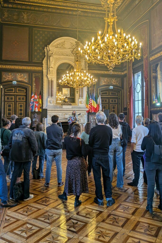 Ce deuxième jour sera très différent de la veille. La soirée débute à la Mairie d’Angoulême, installée dans l’ancien château des comtes d’Angoulême et transformé en hôtel de ville au IXème siècle par l’architecte Abadie fils, qui a laissé sa patte à de nombreux endroits de la ville. Nous avons rendez-vous avec Claire Days dans les grands salons. L’artiste nous accueille en guitare-voix devant une ancienne cheminée… et la photo d’Emmanuel Macron au-dessus de la tête, puisque c’est la salle du conseil municipal, transformée en salle de concert pour l’occasion.